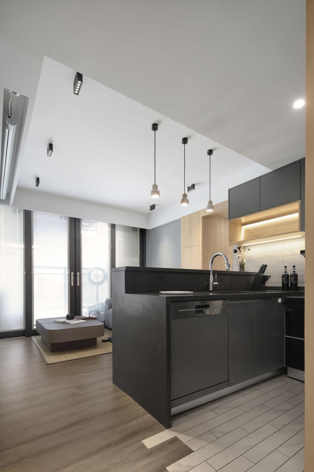 把廚房設(shè)計為開放式,吧臺和餐桌結(jié)合(很少做飯,平時都是點外賣)。