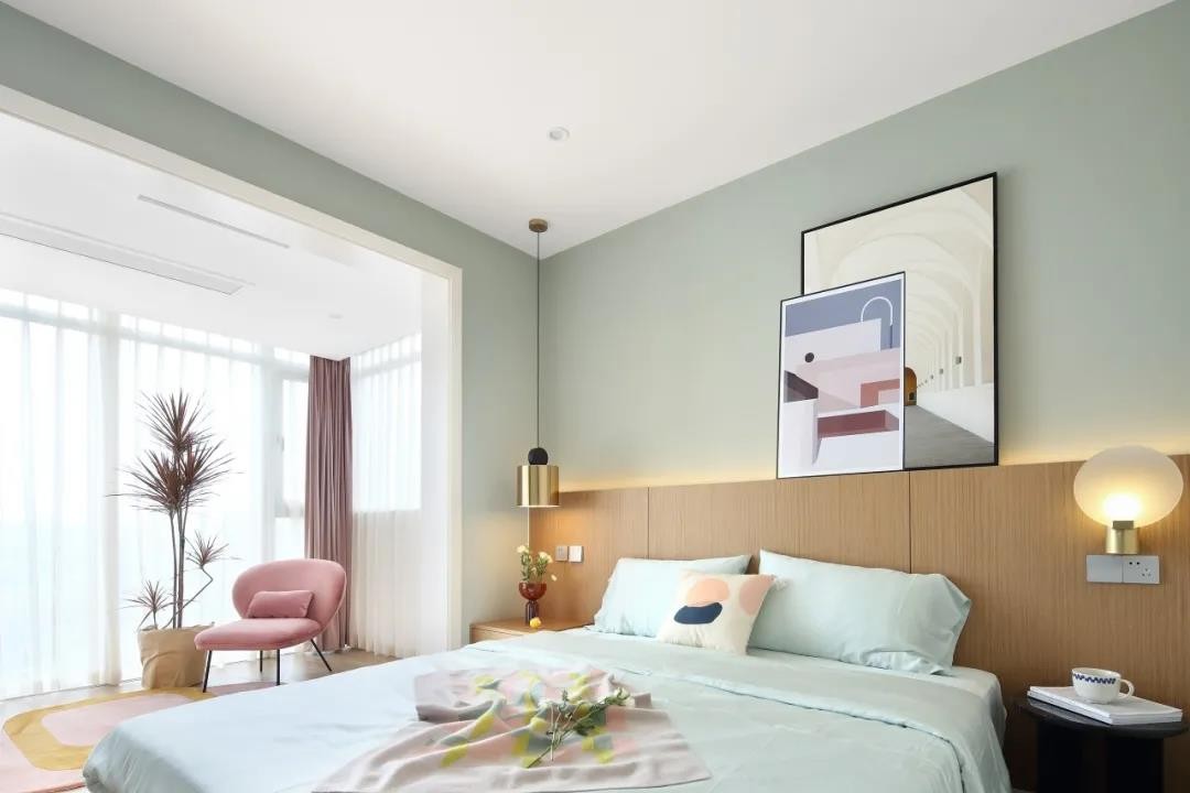 臥室空間整體淡藍(lán)色的墻面,床頭墻的墻腳是木飾面的材質(zhì),加入壁燈吊燈與燈帶,布置裝飾畫,簡(jiǎn)約自然的床單,讓空間顯得清新優(yōu)雅而文藝。