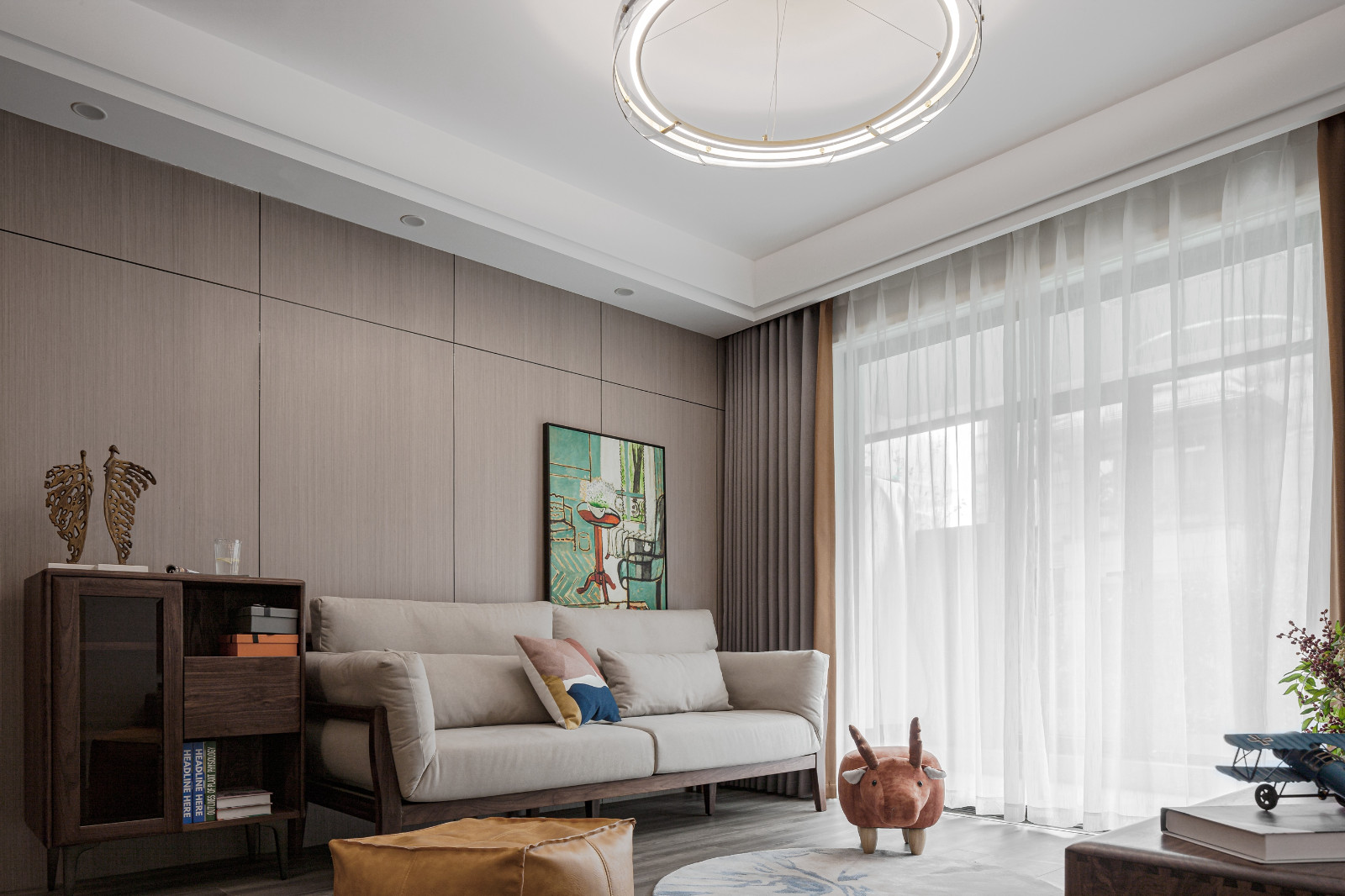客廳戶型方正,整面木飾面板裝飾沙發背景墻,原木家具搭配米色布藝沙發,文藝淡雅。